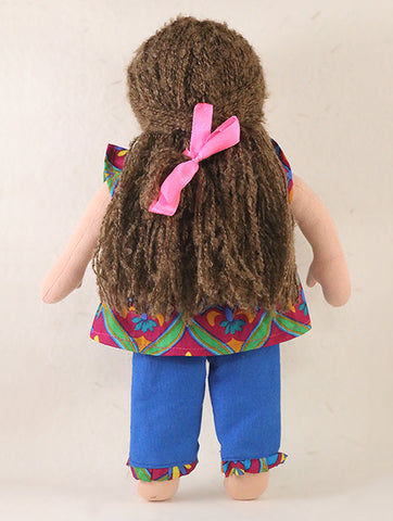 Each doll is individually handmade by one woman from beginning to end - starting with cutting, stitching and filling the doll - to finally sewing on the hair and face - giving each doll a unique personality of it's own.